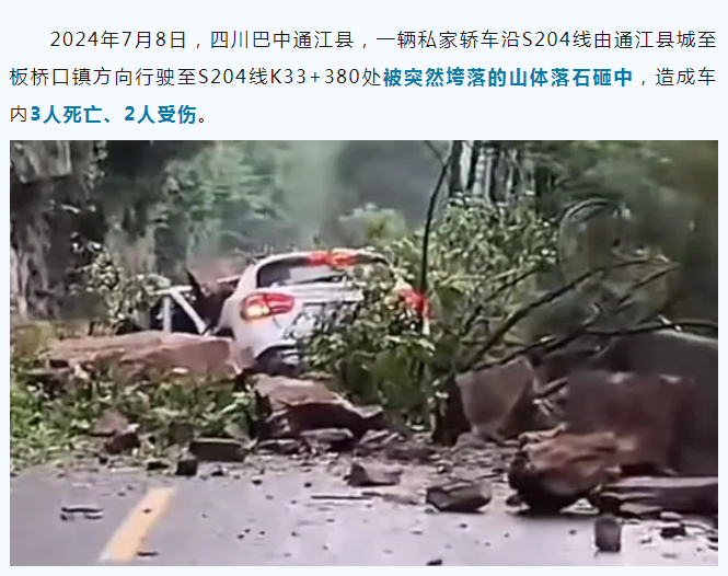 2024年7月8日,四川巴中通江县,一辆私家轿车沿S204线由通江县城至板桥口镇方向行驶至S204线K33+380处被突然垮落的山体落石砸中,造成车内3人死亡、2人受伤。