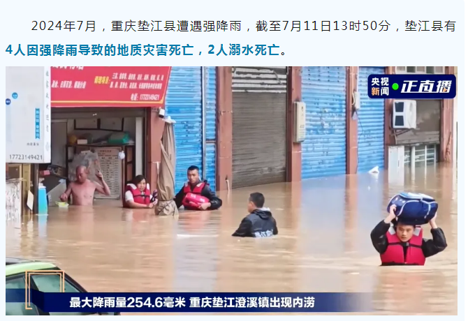 2024年7月,重庆垫江县遭遇强降雨,截至7月11日13时50分,垫江县有4人因强降雨导致的地质灾害死亡,2人溺水死亡。
