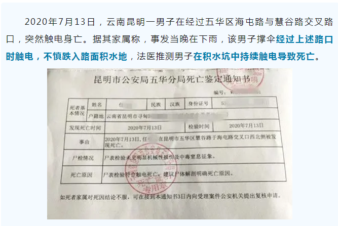 2020年7月13日,云南昆明一男子在经过五华区海屯路与慧谷路交叉路口,突然触电身亡。据其家属称,事发当晚在下雨,该男子撑伞经过上述路口时触电,不慎跌入路面积水地,法医推测男子在积水坑中持续触电导致死亡。