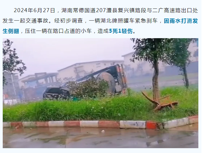 2024年6月27日,湖南常德国道207澧县复兴镇路段与二广高速路出口处发生一起交通事故。经初步调查,一辆湖北牌照罐车紧急刹车,因雨水打滑发生侧翻,压住一辆在路口占道的小车,造成5死1轻伤。