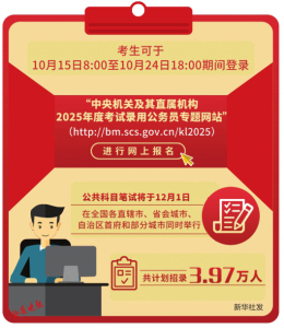 据新华社电 记者14日从国家公务员局获悉,中央机关及其直属机构2025年度考试录用公务员报名即将开始,共计划招录3.97万人。考生可于10月15日8时至10月24日18时期间登录“中央机关及其直属机构2025年度考试录用公务员专题网站”(http://bm.scs.gov.cn/kl2025)进行网上报名,公共科目笔试将于12月1日在全国各直辖市、省会城市、自治区首府和部分城市同时举行。