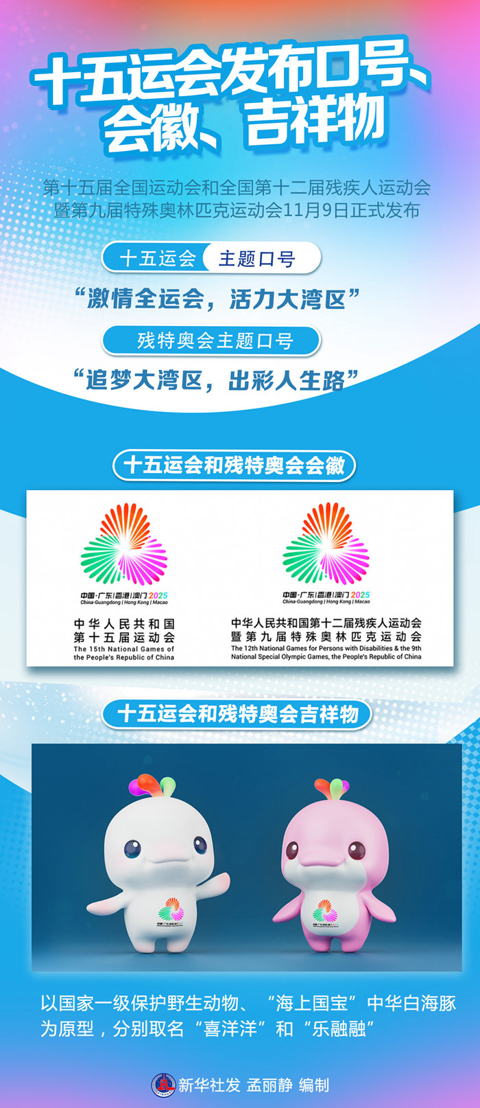 新华社广州11月9日电(记者王浩明)第十五届全国运动会和全国第十二届残疾人运动会暨第九届特殊奥林匹克运动会9日正式发布主题口号、会徽、吉祥物。十五运会主题口号为“激情全运会,活力大湾区”,残特奥会主题口号为“追梦大湾区,出彩人生路”。