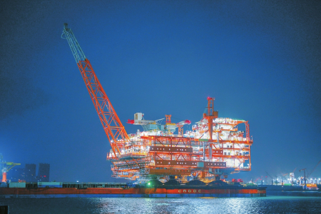 图为11月14日清晨在山东青岛拍摄的渤中26-6油田一期开发项目中心平台装船作业现场。当日,全球最大变质岩油田渤中26-6油田一期开发项目中心平台在山东青岛完成装船作业,后续将赴渤海南部海域,进入海上安装和联调阶段,这标志着该项目陆地建造完工。