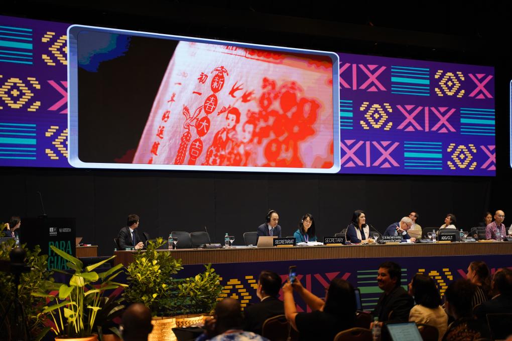12月4日,在巴拉圭亚松森联合国教科文组织保护非物质文化遗产政府间委员会第19届常会评审现场,大屏幕播放春节宣传视频。新华社记者 朱雨博 摄
