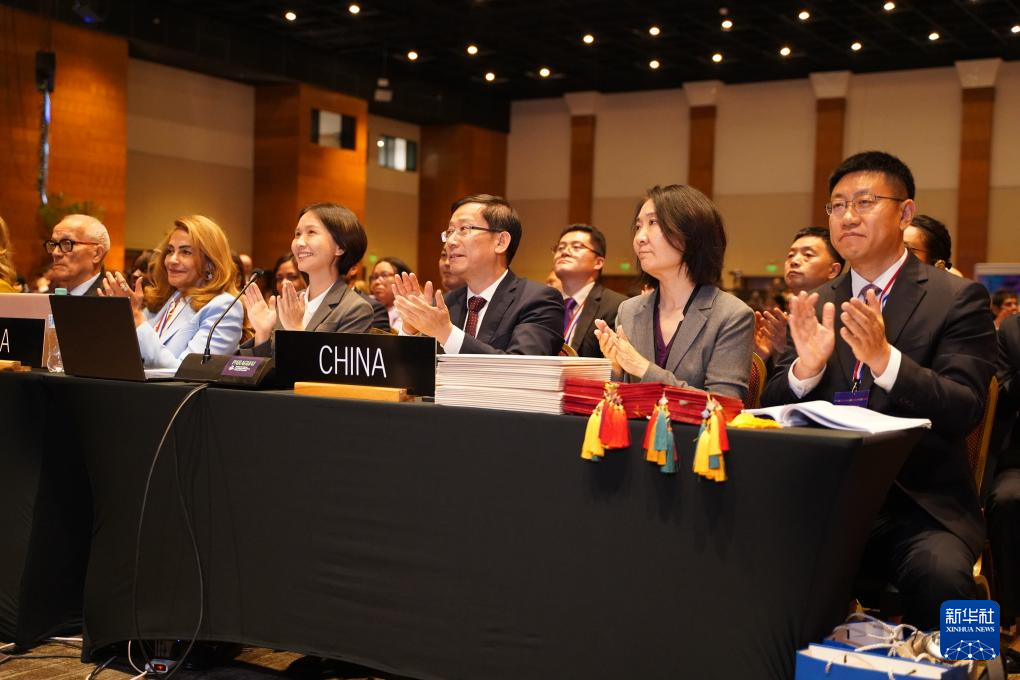 12月4日,在巴拉圭亚松森拍摄的联合国教科文组织保护非物质文化遗产政府间委员会第19届常会评审现场,中国代表团庆祝春节申遗成功。新华社记者 朱雨博 摄