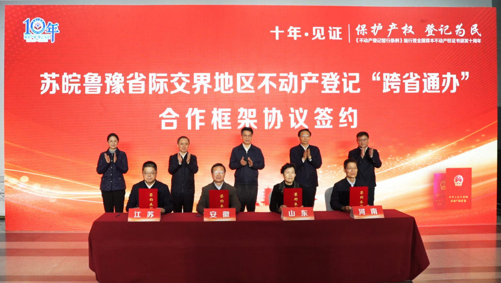 2025年3月1日,《不动产登记暂行条例》施行暨全国首本不动产权证书颁发十周年。在首证颁发地江苏省徐州市举办的现场活动上,苏皖鲁豫省际交界地区合作再扩容,四省十市正式签订框架协议,启动不动产登记“跨省通办”合作。