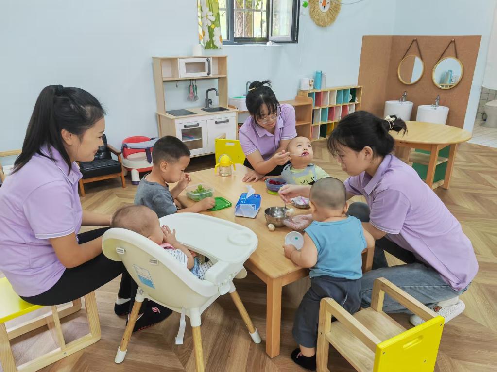 在北京的一家托育园里,孩子们在老师的照料下用餐。新华社发