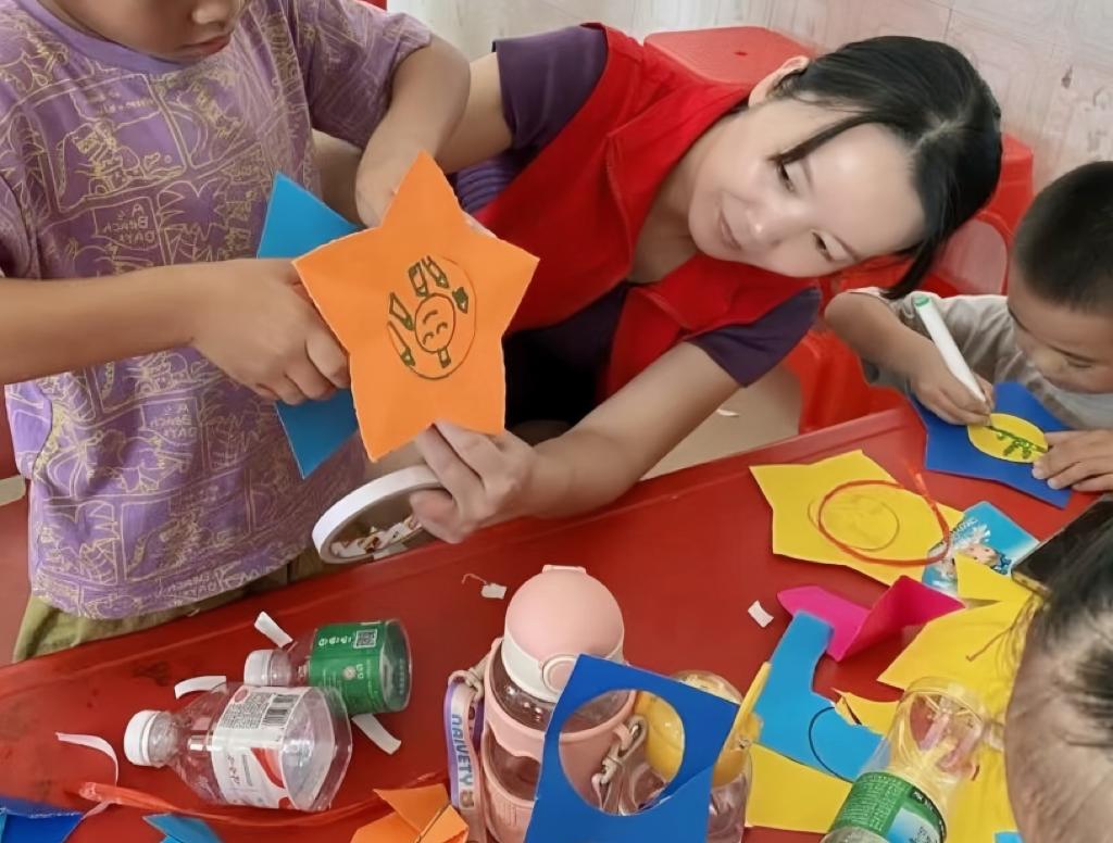 广西南宁市武鸣区“爱心妈妈”志愿服务队队员与孩子一同做手工。新华社发