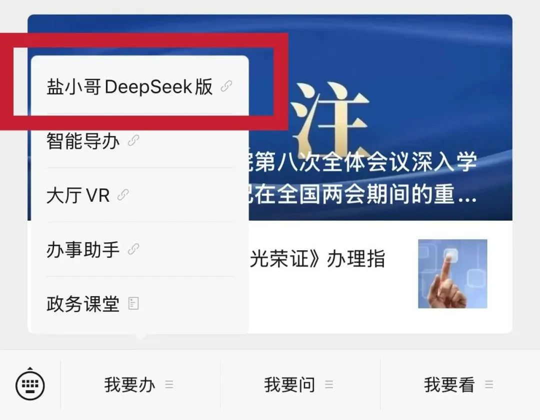 据介绍,市民只需进入“盐湖之家”微信公众号,通过下方菜单栏的“我要办”选择“盐小哥”DeepSeek版智能客服,便可与智能客服进行交流互动,享受“AI导办员”的智能导办服务。