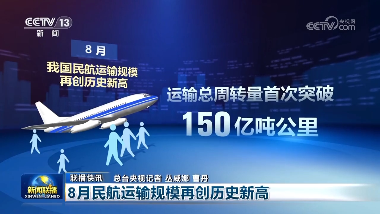 8月,我国民航运输规模再创历史新高,运输总周转量首次突破150亿吨公里,旅客运输量达7536.4万人次,国际航线旅客运输量同比增长15.3%。