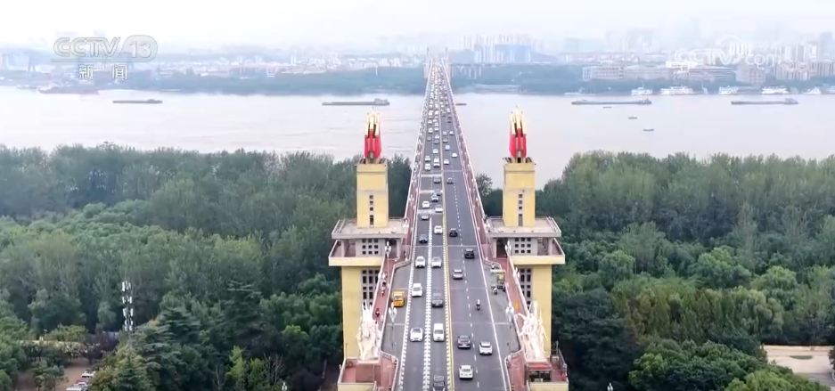 在江苏南京,南京长江大桥装扮一新,喜迎国庆。公路桥桥头堡周边安排了花卉布展。花坛以黄色孔雀草为背景,明亮耀眼,搭配一串红组成的红色花卉飘带,烘托出喜庆的节日氛围。