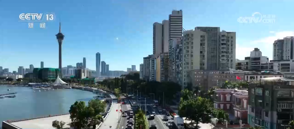 在澳门的主要街道、出入境口岸等地,鲜艳的五星红旗迎风飘扬,在蓝天、绿树的映衬下,构成了一道道亮丽的风景线,为城市增添了喜庆祥和的国庆氛围。