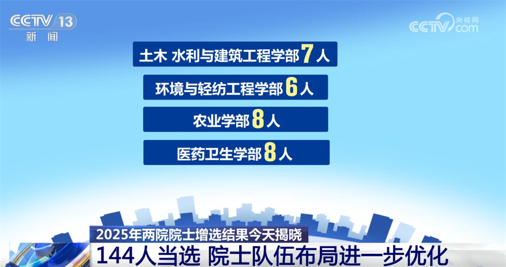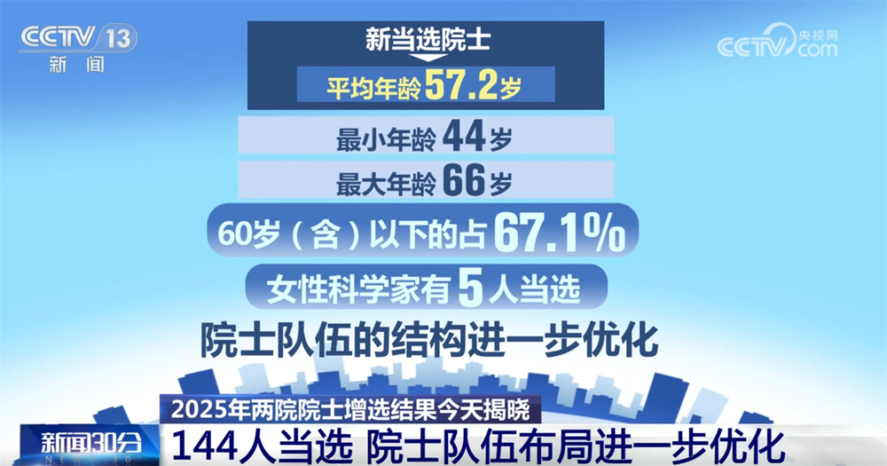 央视网消息:11月21日,2025年两院院士增选结果正式揭晓,共有144人当选,院士队伍的年龄结构、学科、地区和行业布局进一步优化。