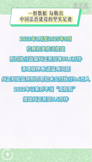 一组数据,勾勒出中国法治建设的坚实足迹:2021年1月至2025年9月,检察机关依法提出刑罚执行监督纠正意见等97.1万件;清理收押难、送监难问题,纠正判处监禁刑罚罪犯未交付执行9.6万人;2022年以来对不当“减假暂”提出纠正意见7.5万件……