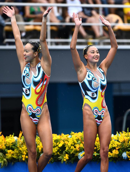 8月16日,中国选手黄雪辰(左)和孙文雁在比赛结束后向观众挥手致意。新华社记者燕雁摄