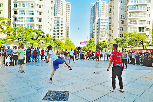 会后,来自全市各地的毽球爱好者展演了各自的绝活儿,小巧的毽球在表演者的脚尖上下翻飞,精彩迭出,高潮迭起,不断博得观众的掌声和叫好声。(鲁明强 摄影报道)