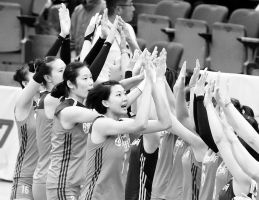 9月9日,中国女排队员相互激励。当日,女排大冠军杯比赛继续在日本名古屋综合体育馆进行。中国女排以3比0战胜俄罗斯女排,取得了第四场胜利。