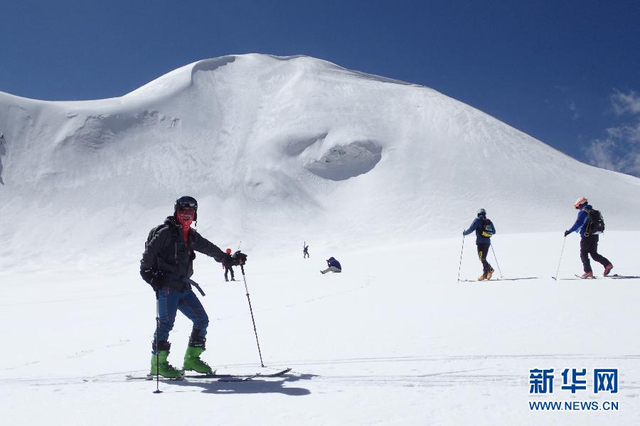 ↑记者第一次见到刘百灵是在第十六届西藏登山大会滑雪登山项目的营地——洛堆峰雪线处,海拔5600米。刘百灵肤色黑得发亮,与身边长年从事高山训练的藏族教练无异。但细问起来,他说自己生在湖南,现居杭州,是地道的南方人。 因为对户外运动尤其是对滑雪的执着,刘百灵的肤色变了,过起了旁人眼中的另一种人生,也成了“异类”。但他却感谢自己成了“异类”。这是10月4日,滑雪爱好者、“体育旅游”探索者刘百灵(左)在位于西藏自治区当雄县羊八井镇的洛堆峰雪坡上练习,此处海拔约5700米。远处的山峰是海拔7048米的穷母岗日峰。 新华社发