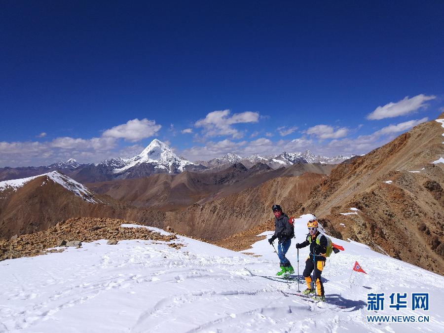 ↑这是10月4日,滑雪爱好者、“体育旅游”探索者刘百灵(左)在位于西藏自治区当雄县羊八井镇的洛堆峰雪坡上进行练习,此处海拔约5700米。远处的山峰是海拔6010米的洛堆峰。 新华社发