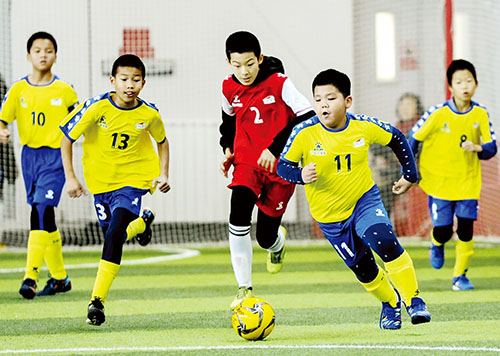 11月18日,2018年新疆维吾尔自治区首届体育产业杯青少年足球联赛在新疆国际会展中心圣丹亚体育运动球场鸣哨开赛。此次足球联赛邀请了来自乌鲁木齐市、新疆昌吉回族自治州部分中小学及俱乐部共14支代表队参加。图为新疆农大附中代表队球员(前)与昌吉足协代表队球员在U12比赛中。据新华社 记者 王菲 摄