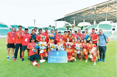 11月10日,在广州举行的2020年东京奥运会女子七人制橄榄球亚洲区资格赛决赛中,中国队以33比0战胜中国香港队,进军东京奥运会。图为中国女子七人制橄榄球队队员赛后合影庆祝。新华社发殷启明摄