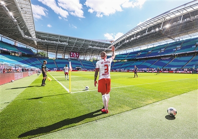 5月16日,德甲莱比锡队球员安杰利诺准备主罚角球。新华社发