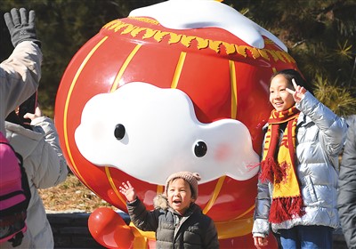 2月20日,在北京市海淀区冬奥文化广场,小朋友与“雪容融”合影留念。新华社记者 任 超摄
