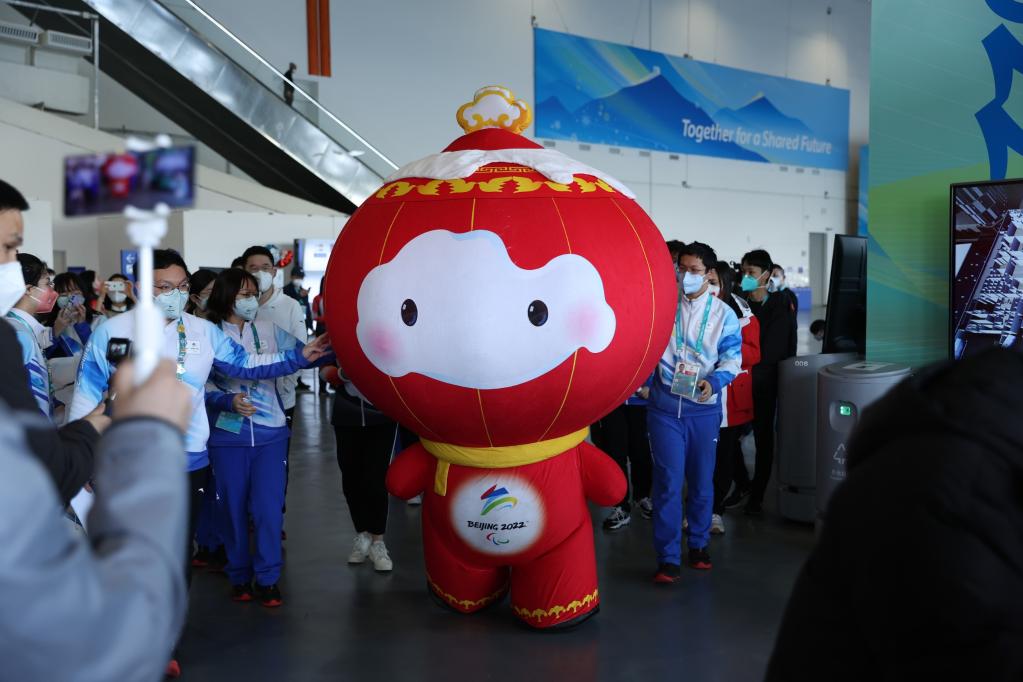 3月8日,北京2022年冬残奥会吉祥物“雪容融”出现在主媒体中心。新华社发(胡星宇摄)