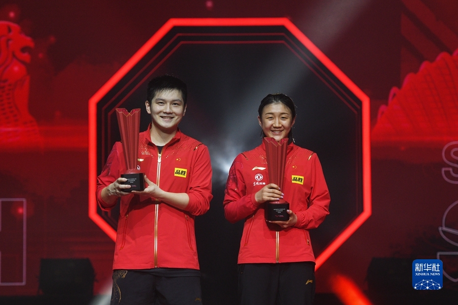 3月20日,中国选手樊振东(左)与本次比赛女单冠军、队友陈梦在颁奖仪式上。新华社发(邓智炜摄)