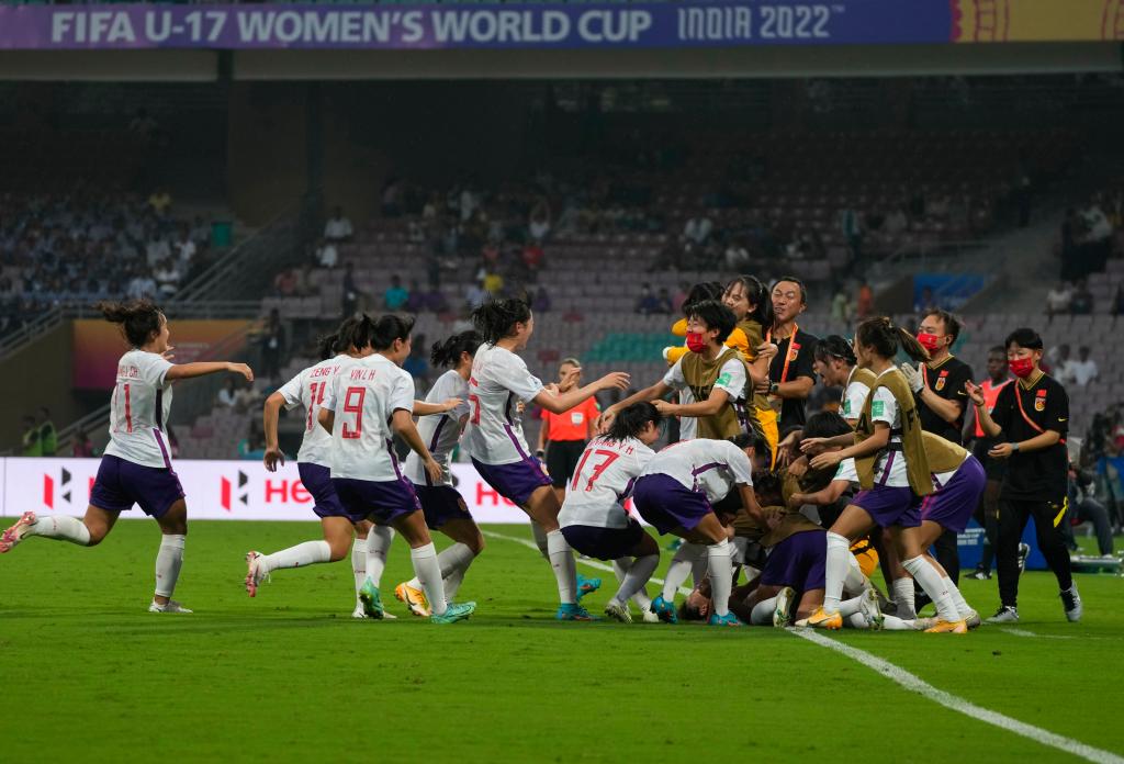 10月12日,中国队球员乔睿琪(右三)在比赛中主罚点球命中后庆祝。新华社/美联