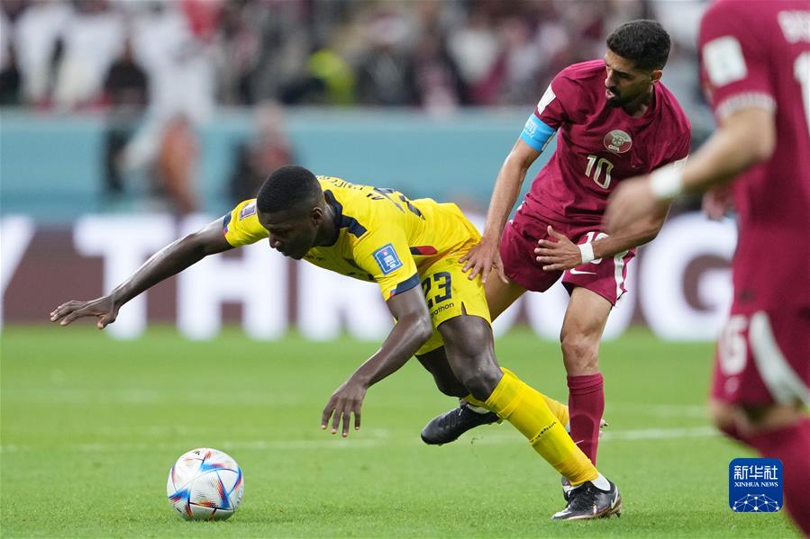 11月20日,厄瓜多尔队球员莫伊塞斯·凯塞多(左)与卡塔尔队球员哈桑·海多斯在比赛中拼抢。新华社记者 郑焕松 摄