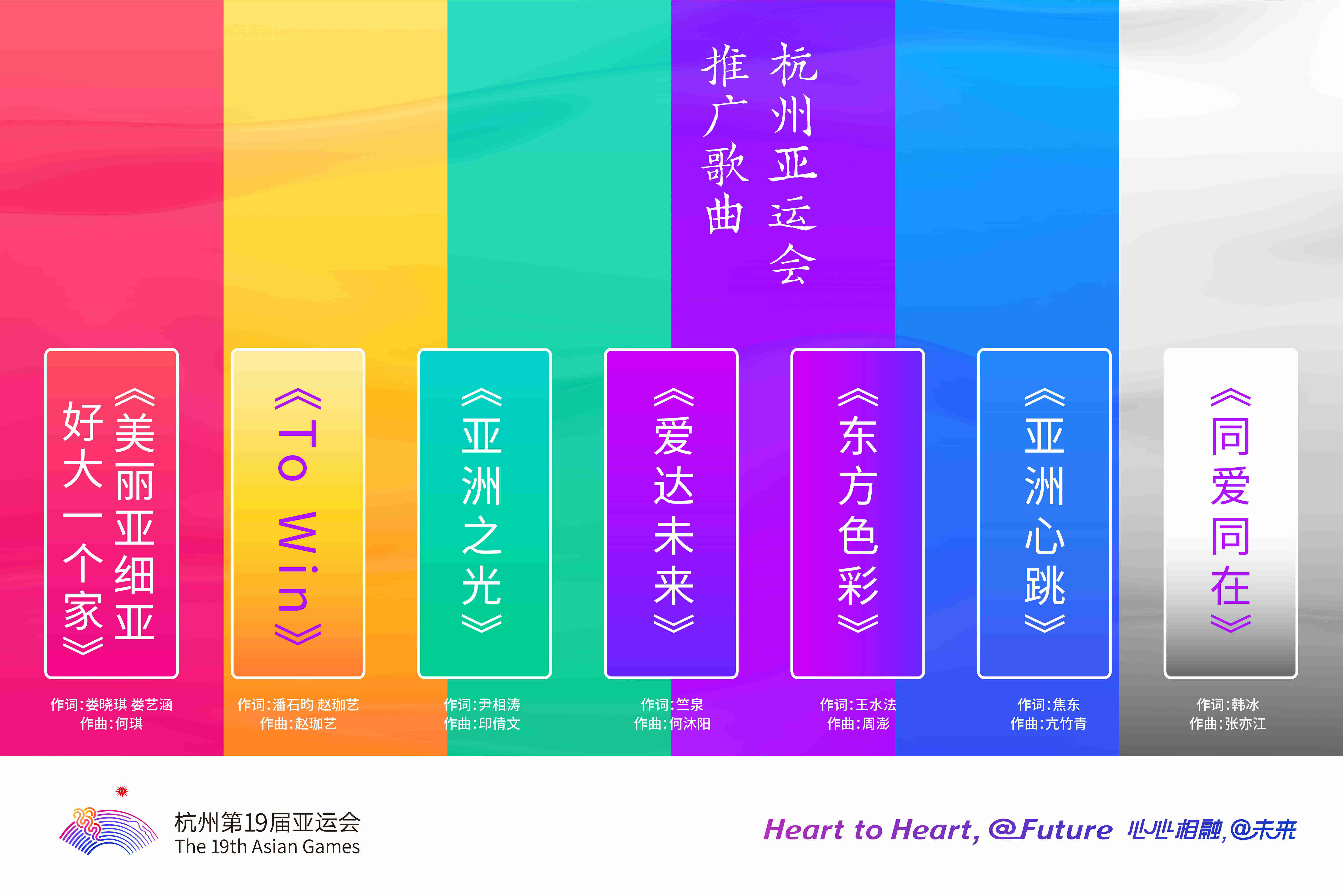 此次发布的《同爱同在》《亚洲心跳》《东方色彩》《爱达未来》《亚洲之光》《To Win》《美丽亚细亚 好大一个家》七首杭州亚运会推广歌曲彰显了不同的音乐风格,传递对亚运盛会的祝福和期待。