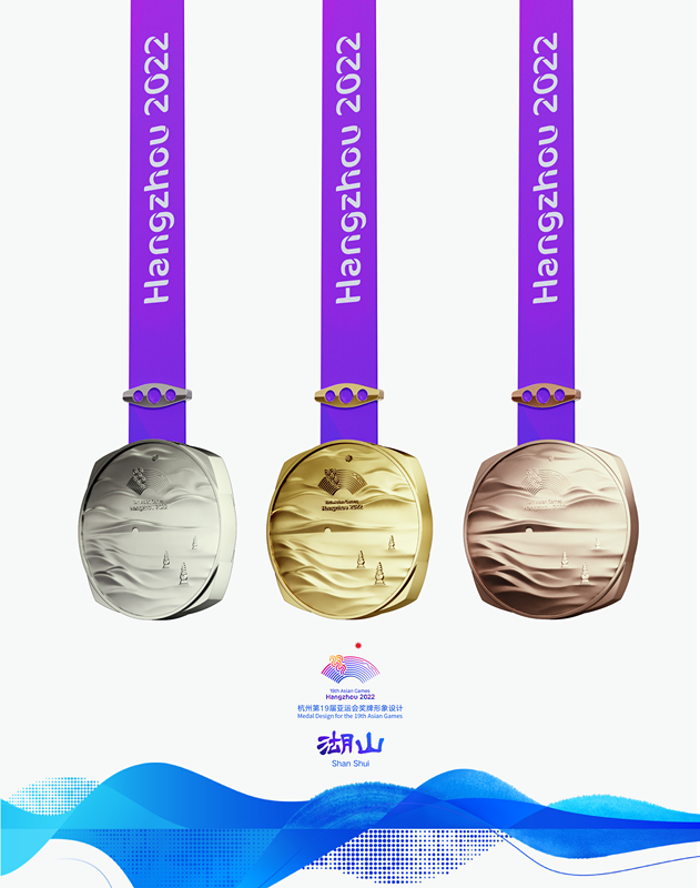 奖牌取名为“湖山”,它的设计灵感源自五千年良渚文明,展示中国江南文化,呈现杭州山水景观。在亚运会奖牌设计中首次将方形玉琮和圆形奖章融为一体,其中奖牌正面用凸出的线条勾勒出“三面云山一面城”的杭城画卷,湖水涟漪,山峦起伏;奖牌背面,形似方形印章,寓意运动员们在杭州亚运会上留下美好的印记。