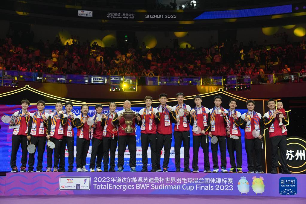 5月21日,2023年苏迪曼杯世界羽毛球混合团体锦标赛颁奖仪式在江苏省苏州市举行。中国队在决赛中以3比0战胜韩国队,夺得冠军。图为中国队在颁奖仪式上庆祝。新华社记者 杜宇 摄