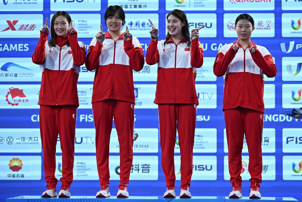 8月1日,获得冠军的中国队选手李冰洁、柳雅欣、张雨霏、罗悠扬(从左至右)在女子4x100米自由泳接力颁奖仪式上。新华社记者张龙摄