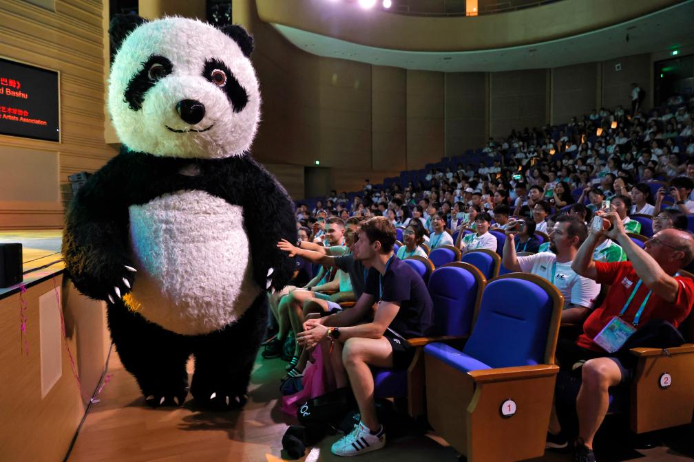 8月2日,一名演员装扮成大熊猫在演出间隙与观众互动。当日,“奇幻之夜”杂技魔术晚会在成都大运村艺术中心大剧场举行。本场活动是在大运村举办的“Be Together”主题系列晚会之一。新华社记者沈伯韩摄