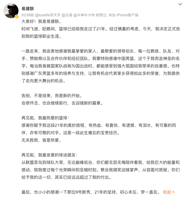 8月29日深夜,易建联在个人自媒体上宣布正式告别篮球职业生涯。