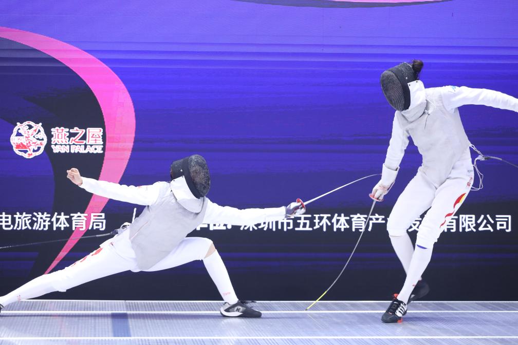 黄芊芊(左)在女子花剑个人决赛中对阵吴培林