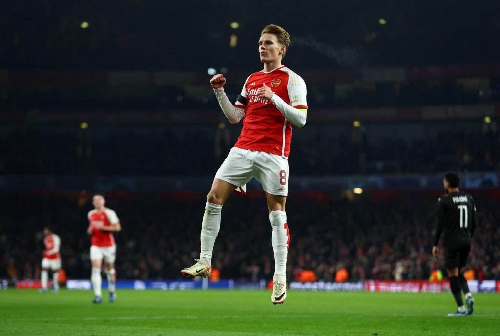 11月29日,阿森纳队球员厄德高在比赛中庆祝进球。