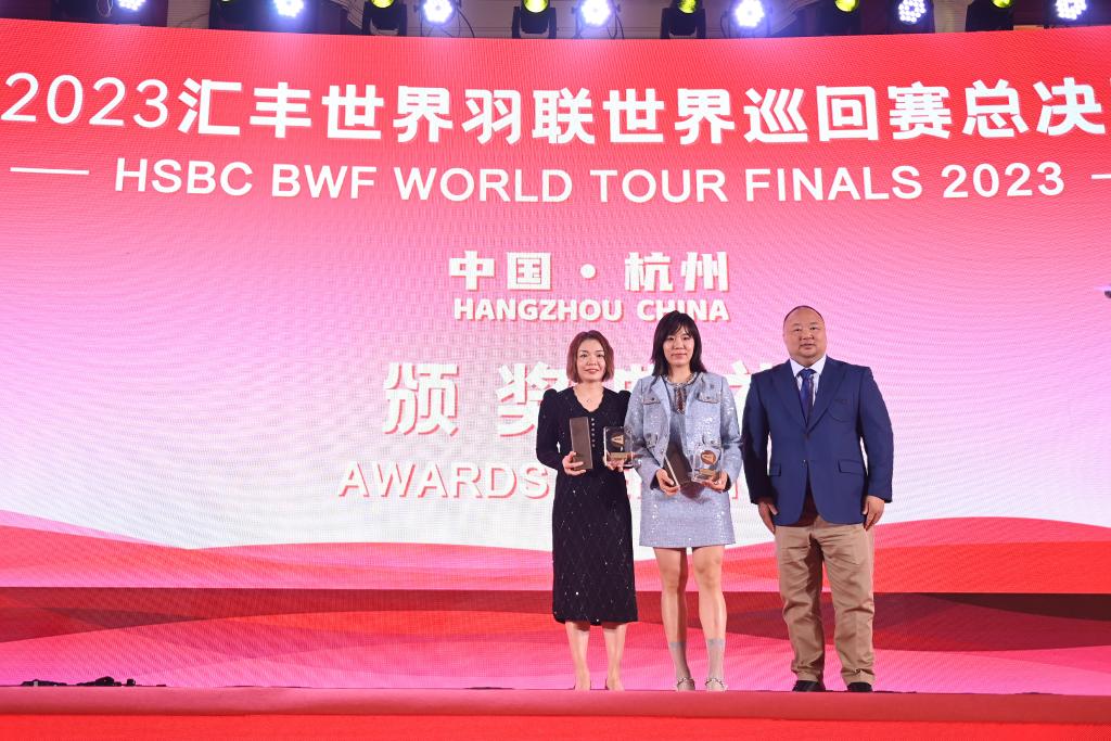 12月11日,获得年度最佳组合奖项的中国选手陈清晨(左)/贾一凡(中)在颁奖仪式上。新华社记者 黄宗治 摄