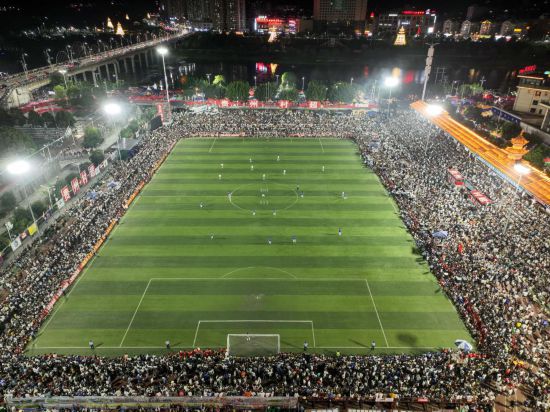 这是7月29日拍摄的夜幕下的“村超”总决赛现场(无人机照片)。新华社记者 欧东衢 摄