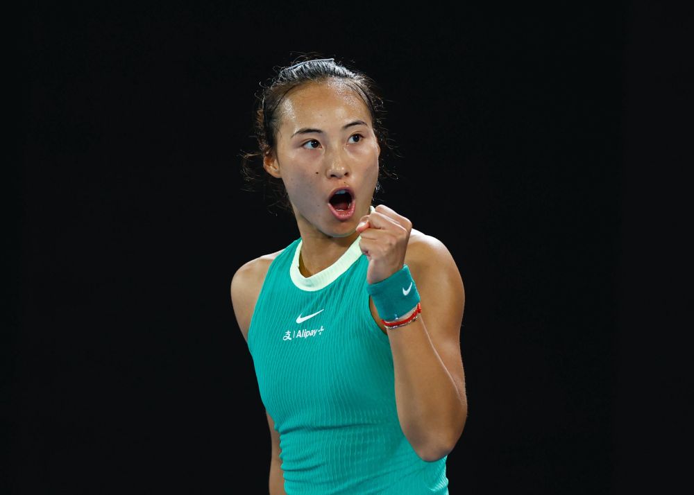 1月25日,郑钦文庆祝得分。新华社发(储晨摄)