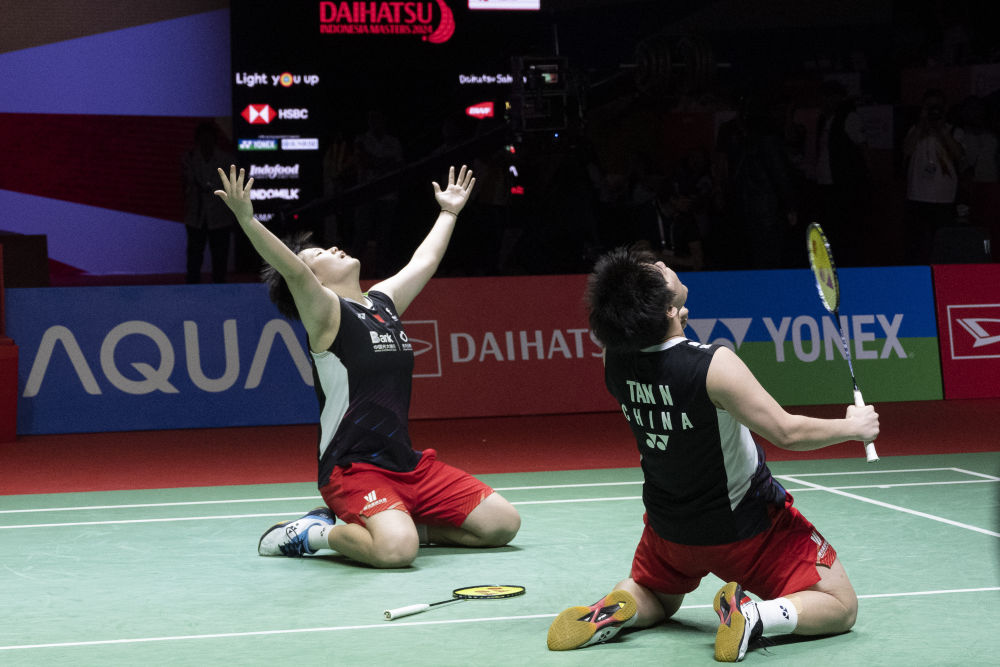 1月28日,刘圣书(左)/谭宁在比赛后庆祝获胜。新华社发(维里 摄)