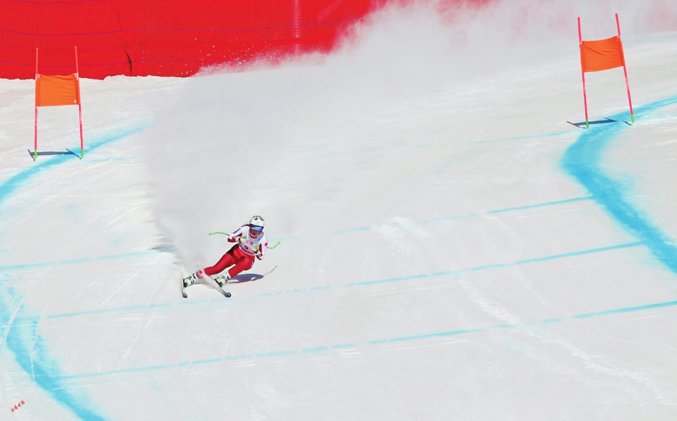 高山之巅,白雪之上,滑雪运动员在落差高达547米的雪道上滑降,他们穿行、回转,快似闪电,如雪上飞燕。