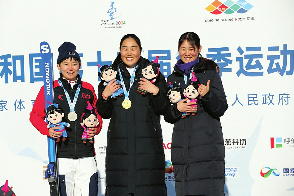 公开组女子滑降比赛颁奖现场,冠亚季军合影。