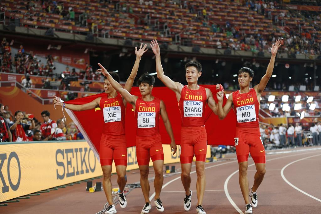 2015年8月29日,中国队选手谢震业、苏炳添、张培萌和莫有雪(从左至右)在2015年国际田联世界田径锦标赛男子4X100米接力决赛赛后庆祝。新华社记者王丽莉摄