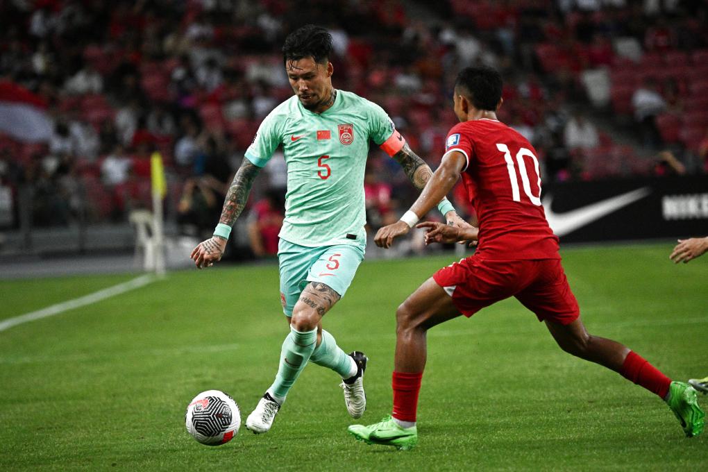 3月21日,中国队球员张琳芃(左)在比赛中与新加坡队球员拉姆利拼抢。新华社发(邓智炜摄)