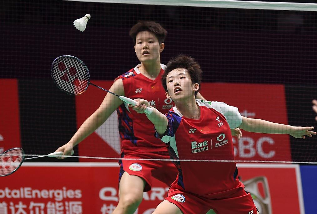 4月28日,中国队组合刘圣书/张殊贤(前)在女双比赛中。新华社记者 侯昭康 摄