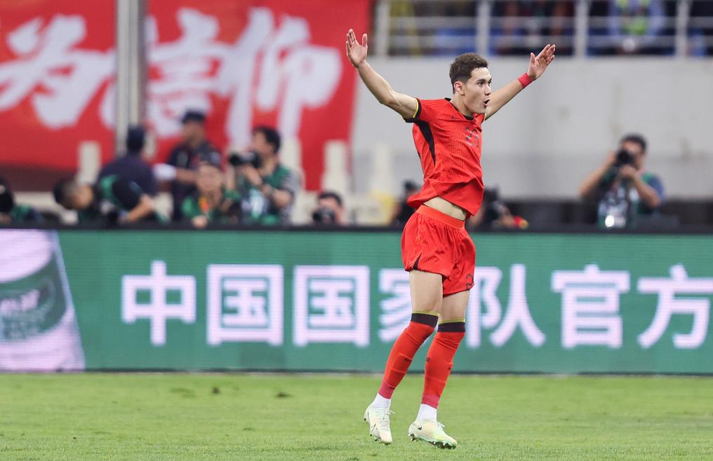 6月6日,首次代表国家队出场的中国队球员拜合拉木在进球后庆祝。新华社记者 贾浩成 摄