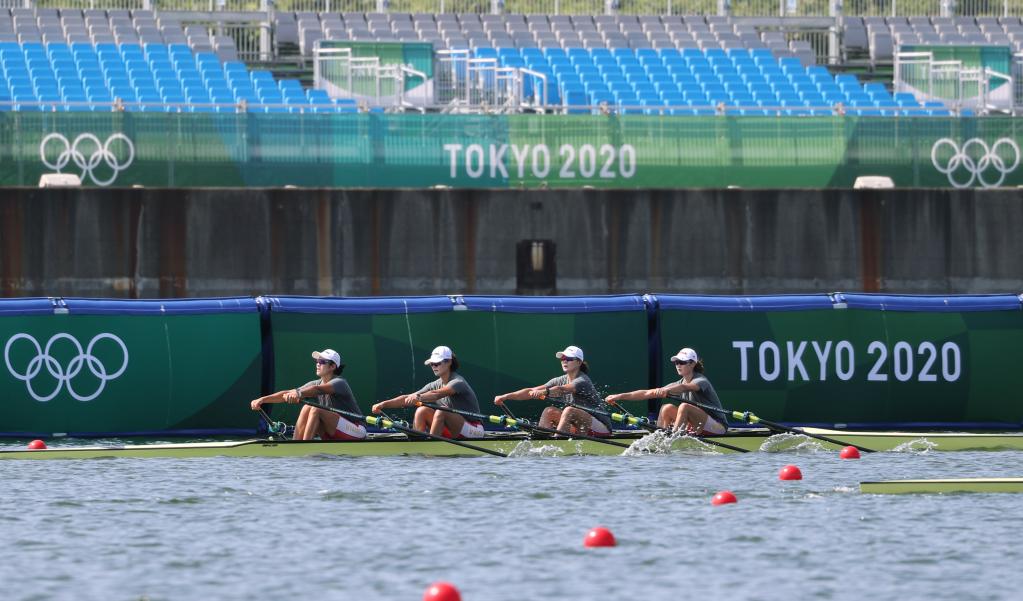 2021年7月20日,中国赛艇队女子四人双桨队员在训练中。当日,中国赛艇队在日本东京海之森水上竞技场训练,备战即将开幕的东京奥运会。新华社记者 杜潇逸 摄